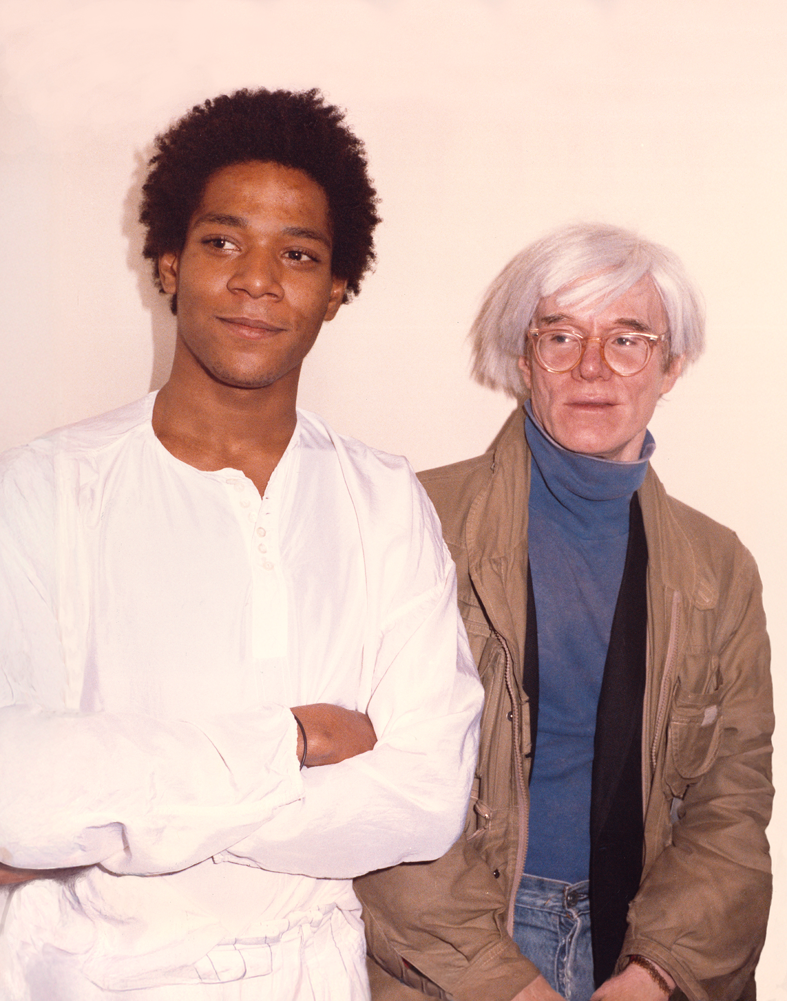 Taken during the  May 1984 opening at Mary Boone Gallery of Basquiat’s only one-man show with her. It was a beautiful sunny Spring day. Andy set up his typical “power corner” against a wall in the entrance vestibule to the gallery. There, Jean Michel and Andy greeted visitors. Shot with Kodak color negative film, and drum scanned on the Howtek 4500 scanner.